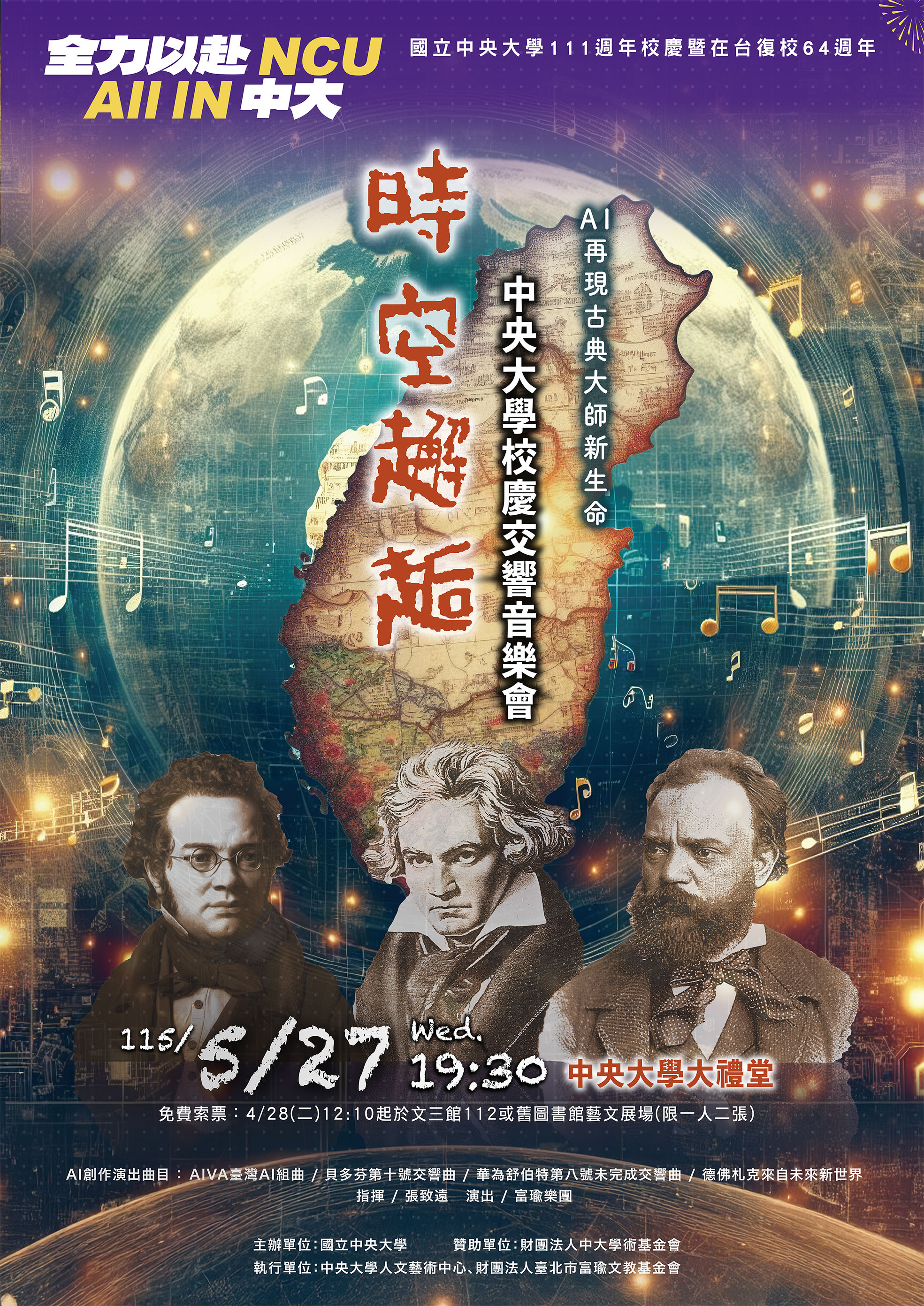 在科技迅速改變世界的時代,人工智慧(AI)正逐漸走入藝術創作的領域,為人類文化帶來嶄新的想像。《時空邂逅》中央大學校慶交響音樂會,正是一場結合古典音樂與人工智慧科技的跨時代藝術實驗。透過AI演算法對音樂語言的深度學習與分析,這場音樂會將帶領觀眾聽見那些原本停留在歷史草稿中的旋律,如何在科技的協助下再次被喚醒。