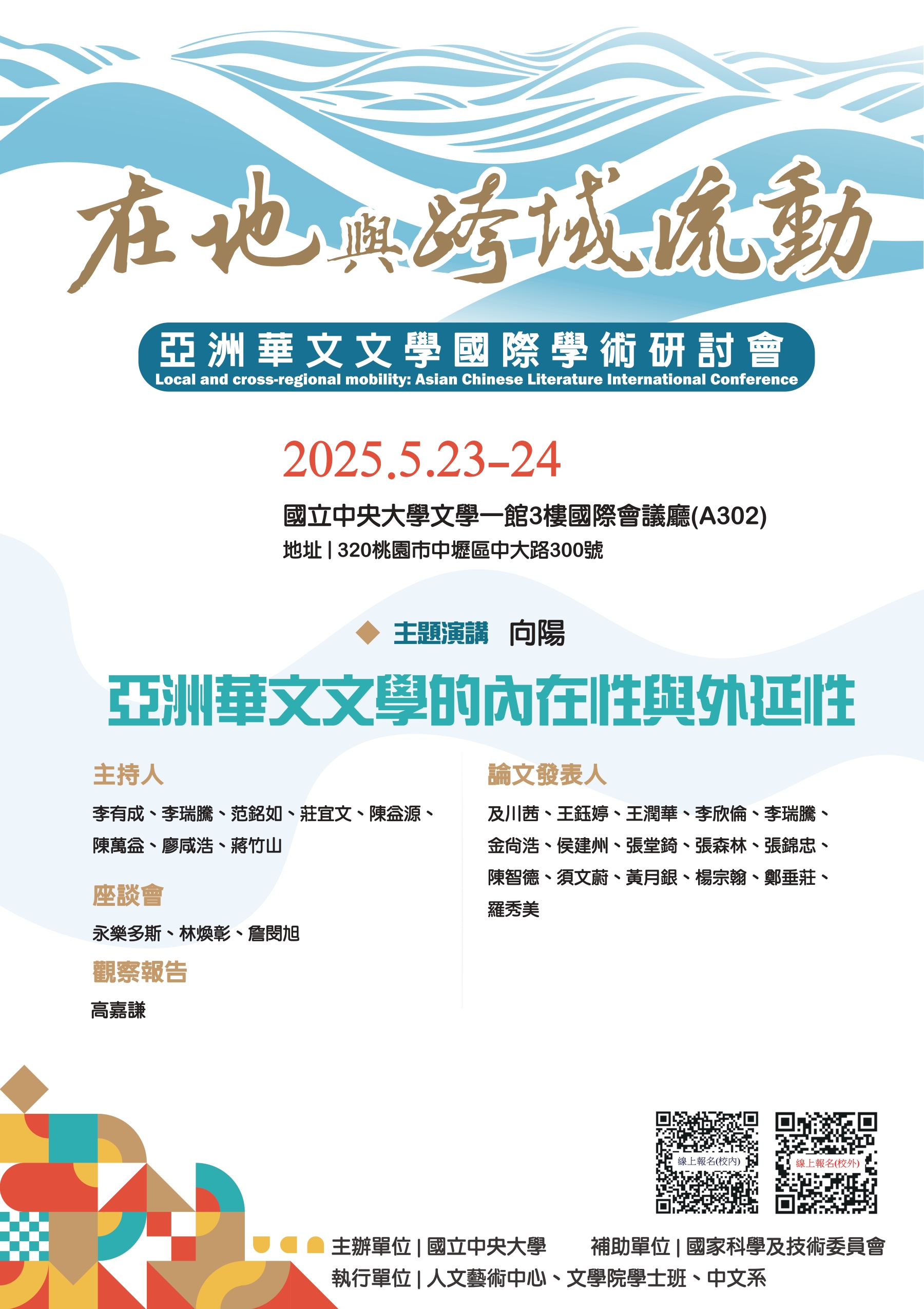 國立中央大學主辦,國科會及桃園市文化局補助,由中大人文藝術中心、文學院學士班與中文系共同執行的「在地與跨域流動:亞洲華文文學國際學術研討會」,於2025年5月23日至24日,假中央大學文學一館三樓國際會議廳(A302)盛大舉行。
